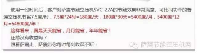上圖為薩震節(jié)能空壓機美女銷售微信朋友圈截圖。該金屬制品有限公司王總在采購并使用了薩震18千瓦節(jié)能空壓機4個月后,主動在其朋友圈中推薦了薩震的節(jié)能產(chǎn)品——使用了4個月,節(jié)能效果很好,值得推薦!(小編在此是倍感榮耀啊,感謝該客戶對薩震節(jié)能空壓機的信任與支持)