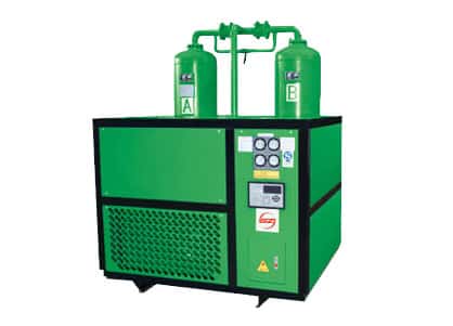 由壓縮機(jī)來的高溫高濕壓縮空氣,首先在換熱器中與干燥過的低溫 壓縮空氣進(jìn)行熱交換,降低溫度,然后進(jìn)入蒸發(fā)器被進(jìn)一步降溫,在蒸發(fā)器中大部分氣態(tài)水分子冷凝成液態(tài)水被排出。此后含濕量很低的壓縮空氣進(jìn)入吸附筒內(nèi)被進(jìn) 一步干燥除濕,得到更低露點(diǎn)的成品氣,后面低溫的干燥壓縮空氣進(jìn)入換熱器,冷卻高溫高濕的入口空氣,同時本身溫度也升高,防止了輸送的管路外結(jié)露,升溫后 的干燥壓縮空氣一小部分用作吸附劑的再生,提高再生效率,降低能耗。
