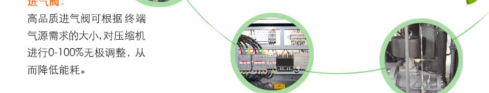 進氣閥: 采用獨特的碟式進氣閥,氣動功能集約化,僅一個運動部件,可靠性高,無需日常維護,并能隨著實際使用氣量的多少,對壓縮的氣量進行0~~100%無級調 解,自動的加載和卸載, 從而降低了能耗,進氣閥內(nèi)設有單向閥,以防止突然停機時,油和空氣回流。壓力損失小,工作壽命長,是目前更可靠,效率更高的進氣調節(jié)方式。