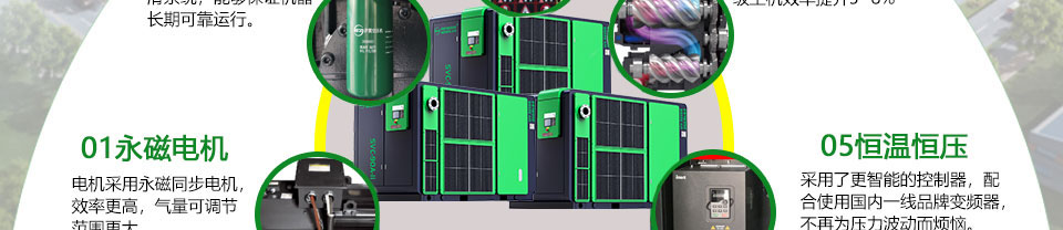 轉(zhuǎn)子:選用對(duì)稱型線,運(yùn)行效率高,選用圓柱滾動(dòng)軸承,提高了承受能力。支撐著轉(zhuǎn)子可靠的運(yùn)行,磨損小,維護(hù)保養(yǎng)費(fèi)用低,主機(jī)壽命長,可靠安全性高。